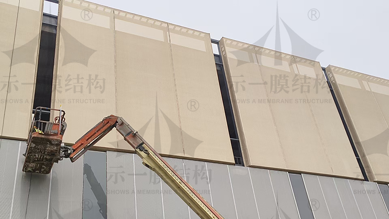3、膜布地面展開安裝附件然后吊裝,將膜布在地面展開安裝好附件,使用小型卷揚機將膜布提升(或提升轉移)至安裝位置的正下方,沿膜單元周邊多點掛設吊點,間距隨膜布大小而確定。