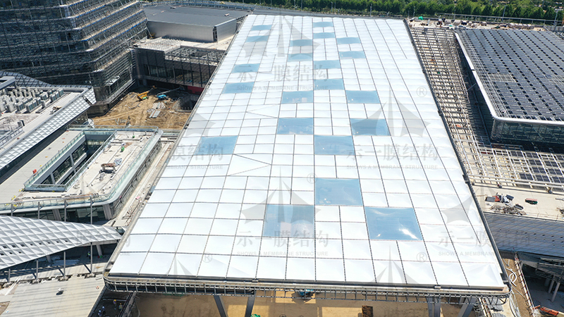 充氣膜結構建筑內部無需使用結構或梁柱,使得其內部擁有超大空間,并且能讓這空間充分被使用。可以通過鼓風機向膜結構內部送氣,因此充氣膜結構建筑可以使用智能化體系,做到實時監控數據。與其它建筑相比,充氣膜結構建筑減少了支承結構和構件的制作及安裝工序,僅需制作完整的充氣膜結構即可,這樣可以大大減少建設周期。由于所需的構件相對較少,所以相對的運營成本較低、保護措施也可以相對的簡單。充氣膜建筑雖然結構相對簡單,但是膜結構材料構本身擁有自重輕、抗風、防腐蝕等特點。所以能做到節能環保,而且氣膜內的空氣凈化體系,可將霧霾和污染空氣徹底擋在館外,讓館內實現恒濕恒溫的效果。由于結構簡單,所以拆開容易,搬運方便,可重復使用。
