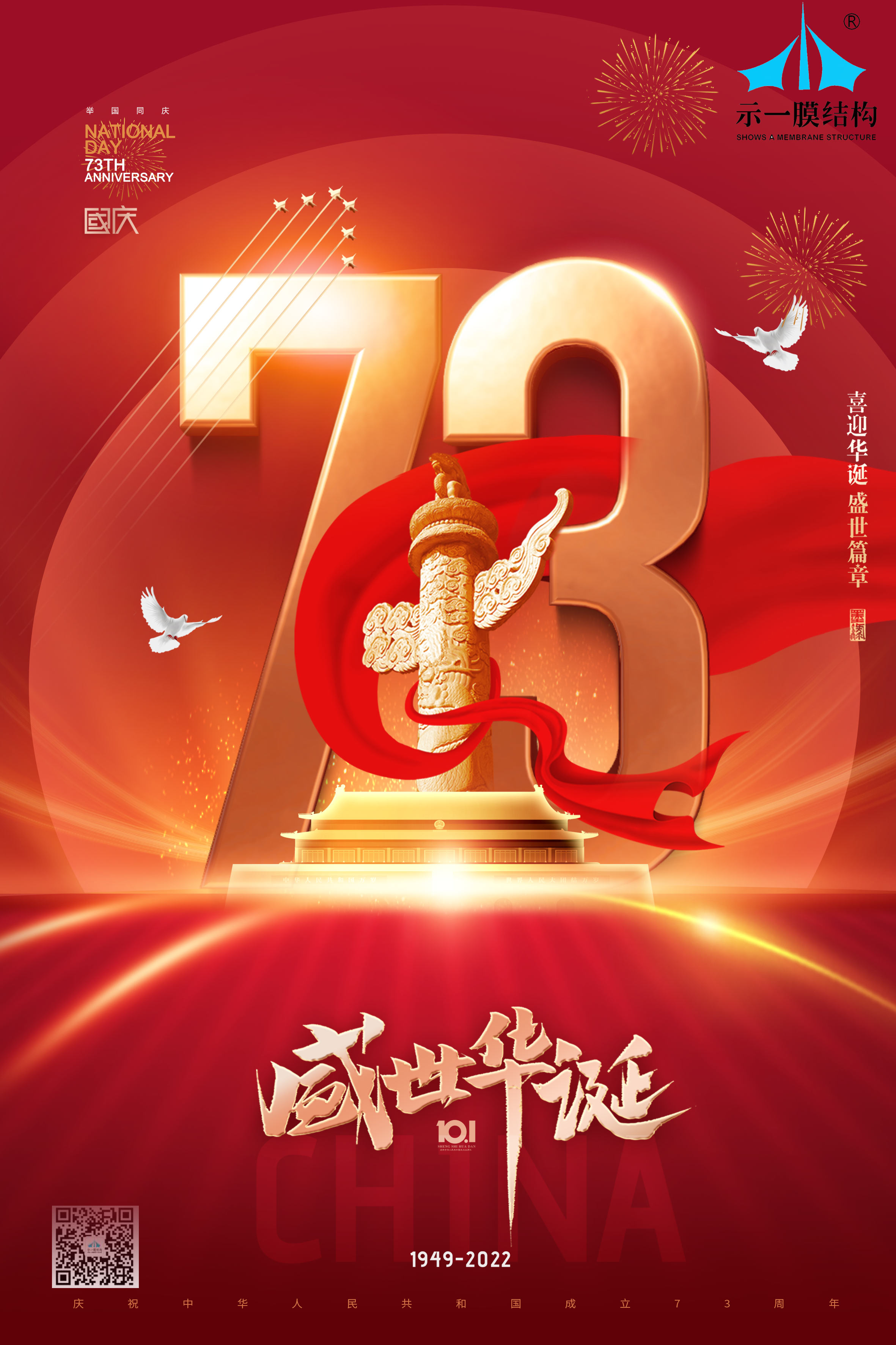 金秋十月,燦爛的陽光充滿著喜慶的味道,秋日的田野蕩漾著豐收的微笑,馬路上紅色國旗已經隨風飄揚,又是一年國慶佳節到,上海示一膜結構有限公司祝福我們的祖國繁榮昌盛,富強更輝煌!