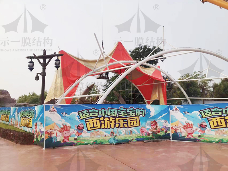 結構安裝主要為支撐結構的安裝和膜面的安裝,安裝步驟為:校驗鋼架尺寸—焊接連結件—地面展膜連接配件—反疊膜片—吊裝—打開膜片—張拉—定位—調整。