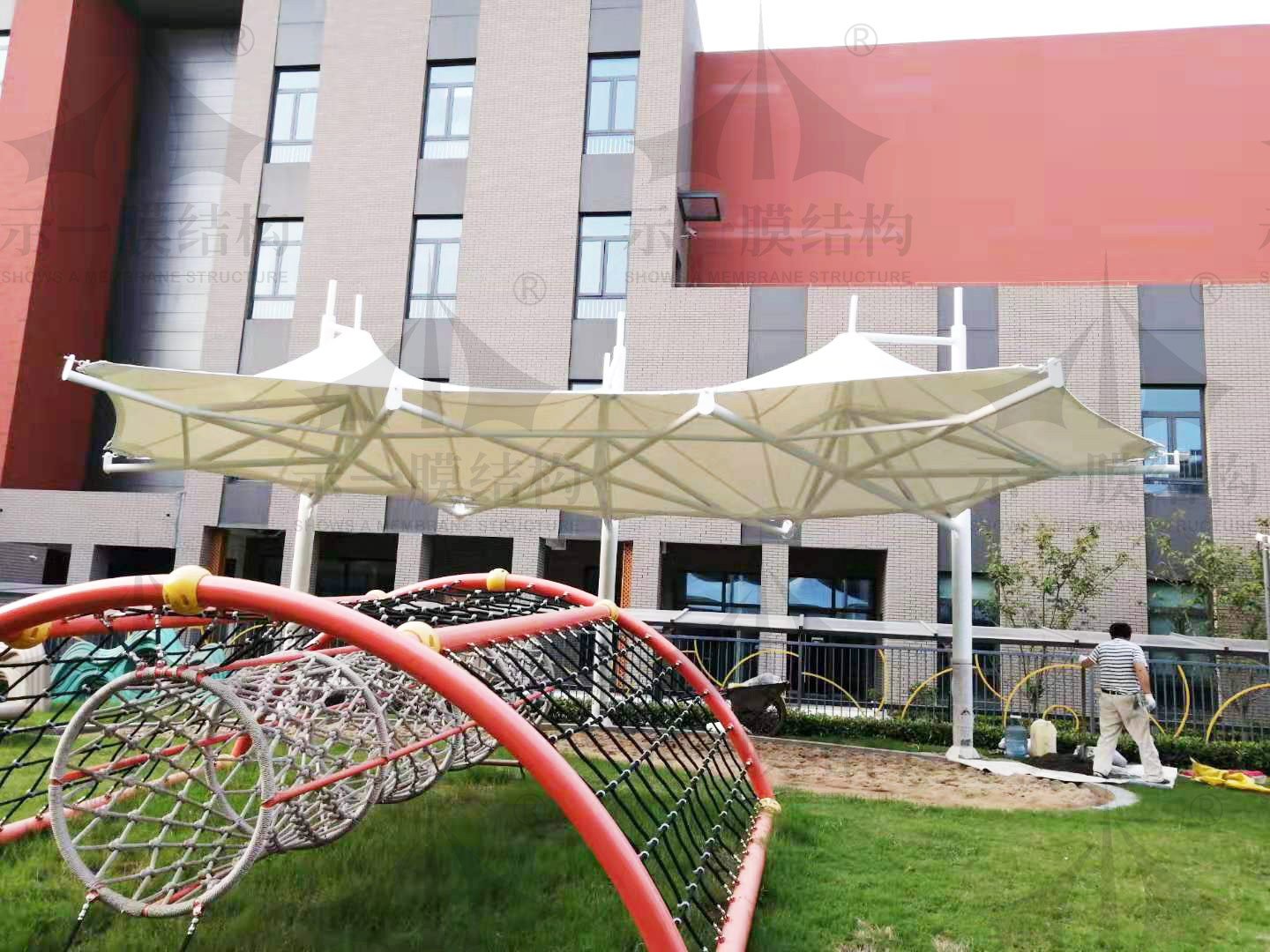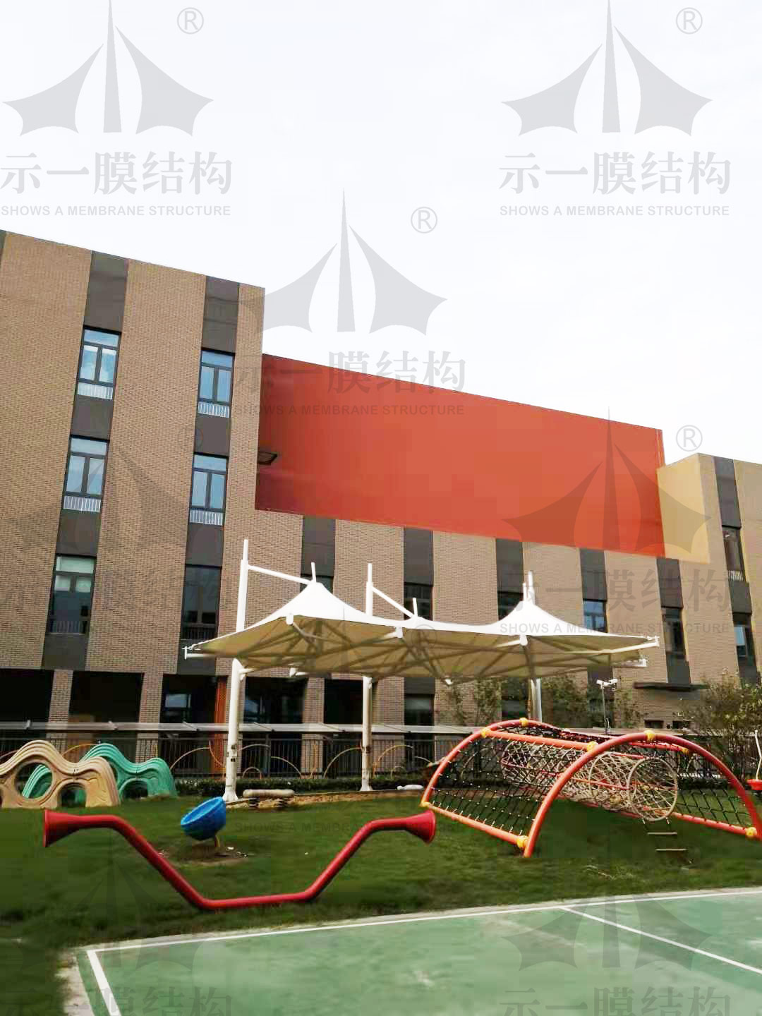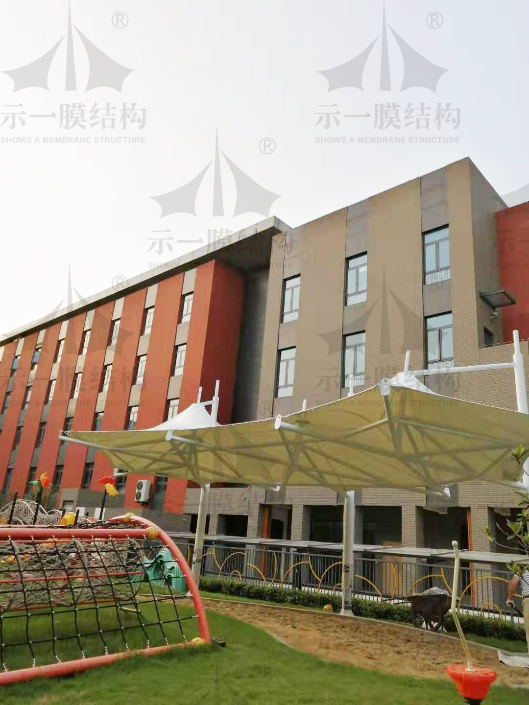 在蘇州工業(yè)園區(qū)海歸人才子女學校南校區(qū)幼兒園里一個沙坑景觀膜結構遮陽棚完工了,這個膜結構景觀遮陽棚的位置是在園區(qū)內的戶外沙坑中,主體結構是以鋼管為基礎,搭配不同彎度的彎管再結合冒頂遮陽張拉膜形式組合而成,遠看外形有點像傘,而近看是一個非常美麗的冒頂遮陽棚。當膜結構遮陽棚進近校園時常常不僅給校園的環(huán)境增添了不少色彩,還給同學們提供了更好的戶外活動場所,膜結構遮陽棚在小朋友們參加戶外活動時提供更好的遮陽遮雨的保護效果。
