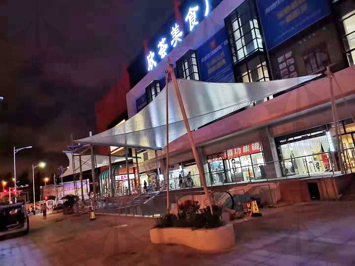 江橋張拉膜項目工程位于一個熱鬧的美食廣場門口,這是一個組合式樣的張拉膜遮陽棚。整個張拉膜遮陽棚分成三個部分,左右部分是兩邊分別在兩個下層式扶手電梯入口處用張拉膜的形式展開的遮陽棚。中間是一個長廊式的入口遮陽棚,三個部分組合成一個完整的張拉膜遮陽棚。最特別的地方是兩邊的張拉遮陽棚采用的是白色膜布,而中間的長廊式遮陽棚的造型和顏色和兩邊都不同是藍色的膜布,所以這個是整個張拉膜遮陽棚中的看點。