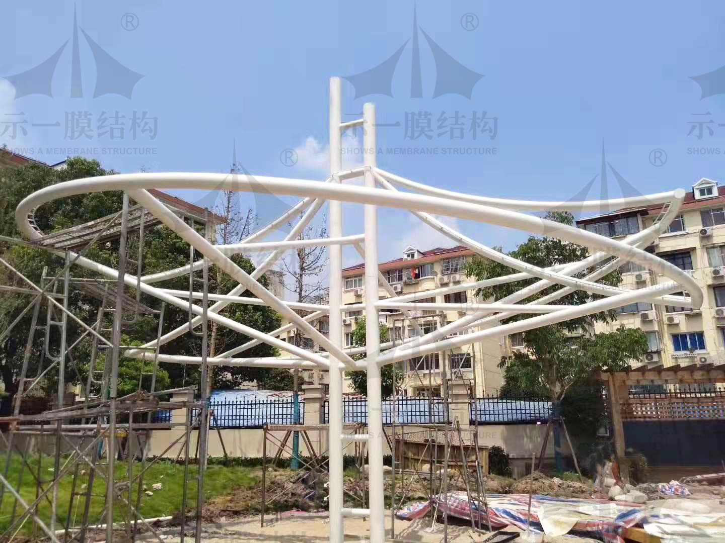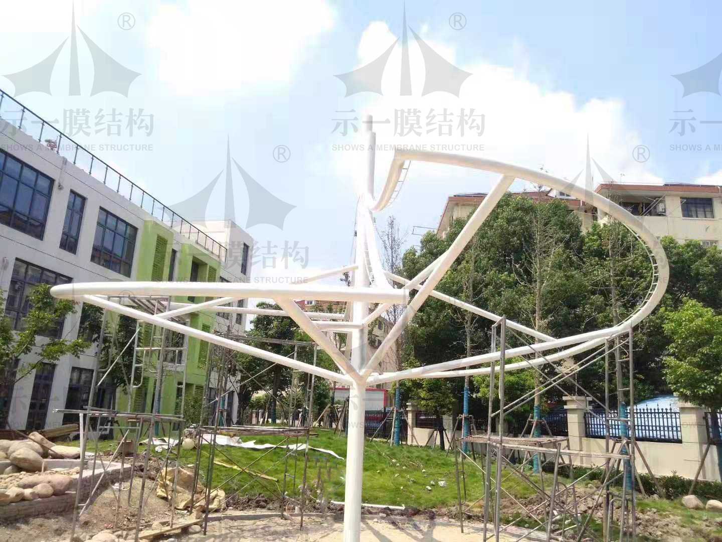 在上海徐匯望德幼兒園里面上海示一膜結構有限公司正在制作一個膜結構景觀遮陽棚,小編想說這個膜結構景觀遮陽棚是有特別之處的。為什么這么說呢?因為它是在沙坑中建造的。膜結構景觀遮陽棚在結構上主要采用的是鋼管,通過鋼管的彎曲搭配中間的兩根立柱組建成兩個層次錯開的螺旋形狀。再通過膜布的張拉后完成,整個造型雖然談不上很大,但是卻恰到好處,能很好的結合園區周邊的環境,是校園里一道美麗的風景線。