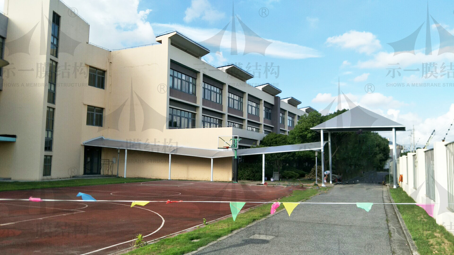 我們在炎炎夏天完成了上海英國學校的一個膜結構遮陽棚,它是屬于膜結構連廊加冒頂遮陽棚的組合形式,這種形式的膜結構建筑比較新穎。而校園里的另一邊是膜結構張拉棚,能給同學們遮風擋雨,下雨天在室外活動也變得是一種可能。而膜結構張拉棚的重點之處是可以完全與周圍環境融合。膜結構遮陽棚又是一個在體育活動課上累后的休息處,關鍵是膜結構遮陽棚很好的阻擋了紫外線。美好的校園生活是值得開心的!