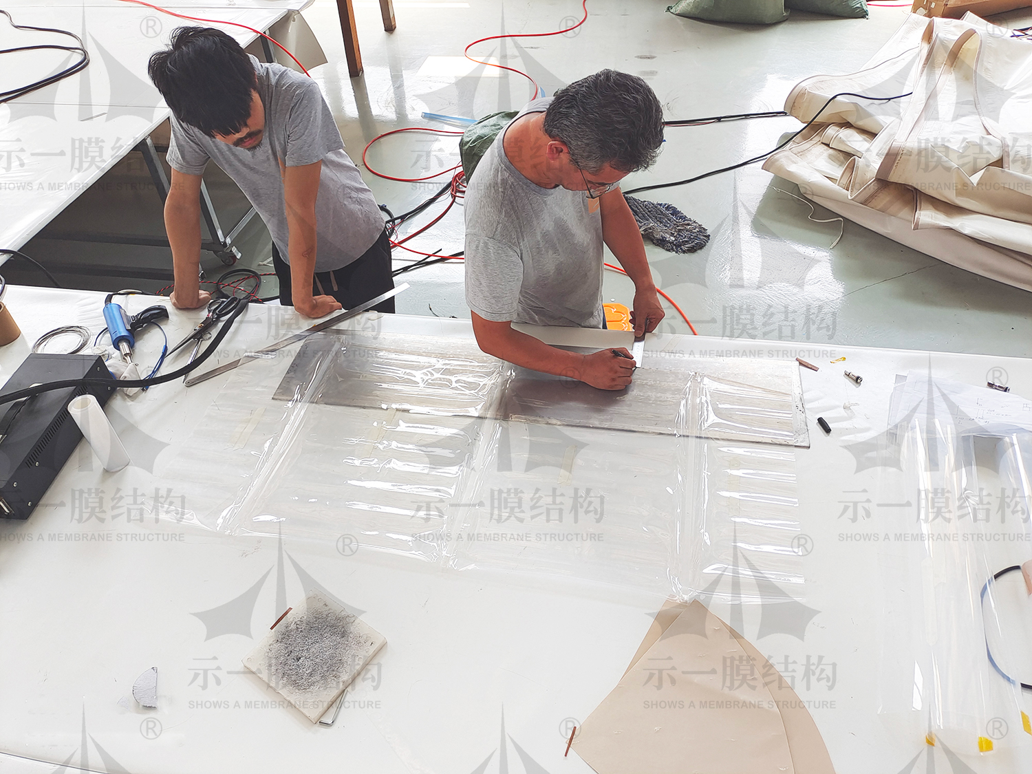 膜布車間對于加工ETFE膜材也頗有經驗,ETFE膜是透明建筑結構中品質優越的替代材料,多年來在許多工程中以其眾多優點被證明為可信賴且經濟實用的屋頂材料。同時ETFE膜材具有良好的工程技術特性,撕拉極強、抗張強度高、中等硬度、抗沖擊能力、伸縮壽命長、裝飾性好,色彩鮮艷、光澤動人、自潔性好等一系列特點使其成為一種新型的建筑材料。