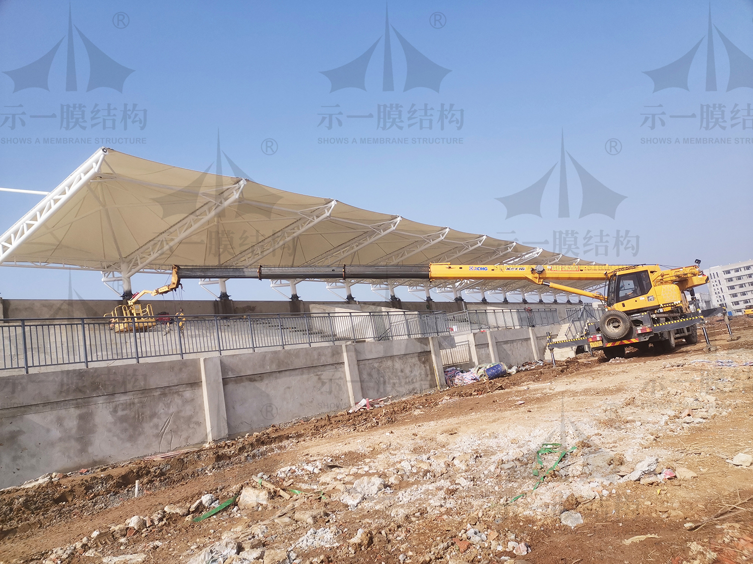 膜結構看臺常用材料有:PVDF膜材料和PTFE膜材料。采用PVDF膜材花色眾多好保養,它耐酸堿的侵蝕,下雨雨水洗滌擦干即可。唯一需注意的是,膜材的材質性能不同,功能也相對不同。選擇PTFE膜材具有超高的自潔性能又防火,性能方面與PVDF膜材都勝一籌,質感較溫和。但色彩較為單一,價格也相對高。不易被人們所接受。