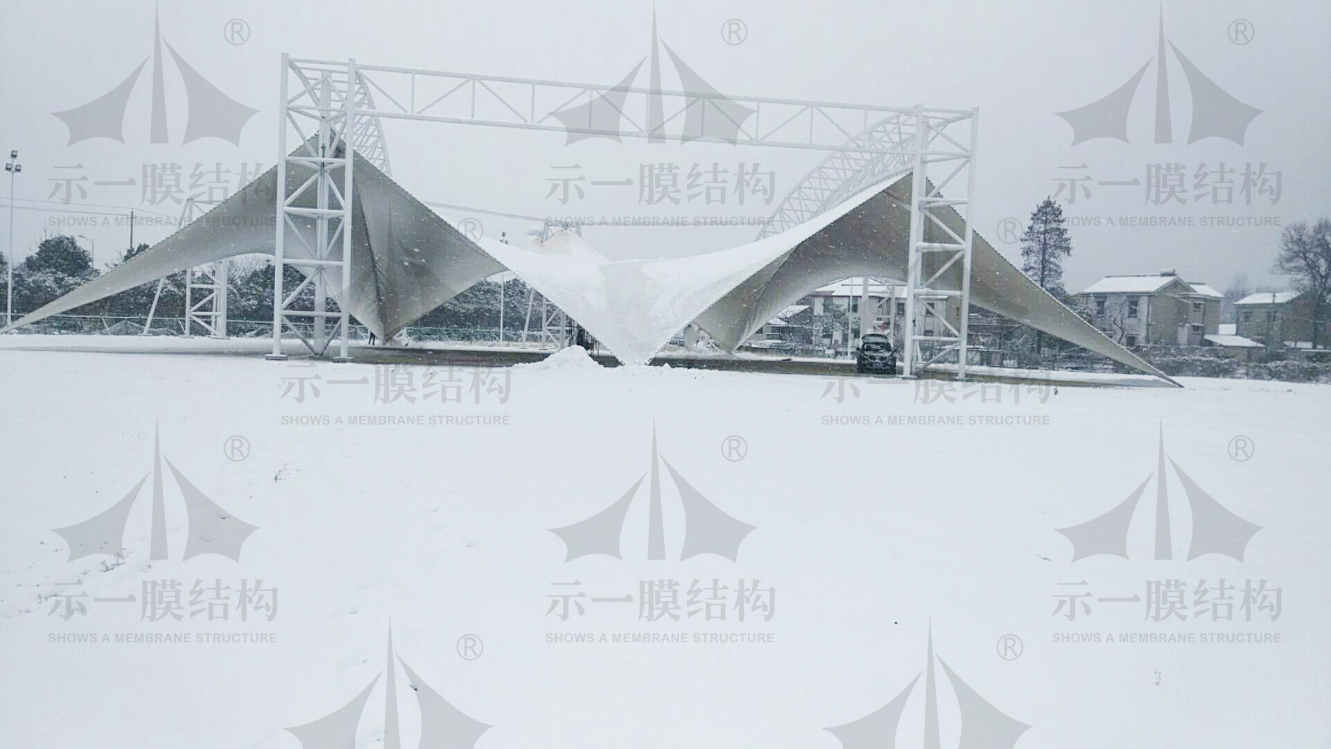 通常我們對長時間積雪的結構采用的是融雪措施或是采用高強度膜材。通常在規劃膜結構修建時,會考慮當地的自然環境,賦予必定的風荷載,雪荷載才能。但凡隨著膜結構使用年限的添加,其膜材功能通常會有必定程度的下降,當積雪較大時,就簡單產生陷落狀況,使膜布直接損壞,即便沒壓塌,或許會引起了膜布變形。
