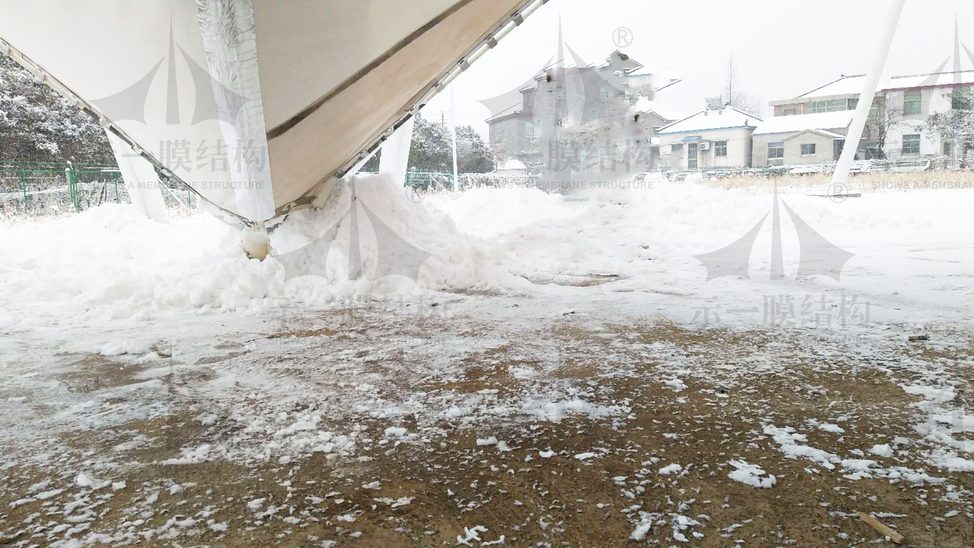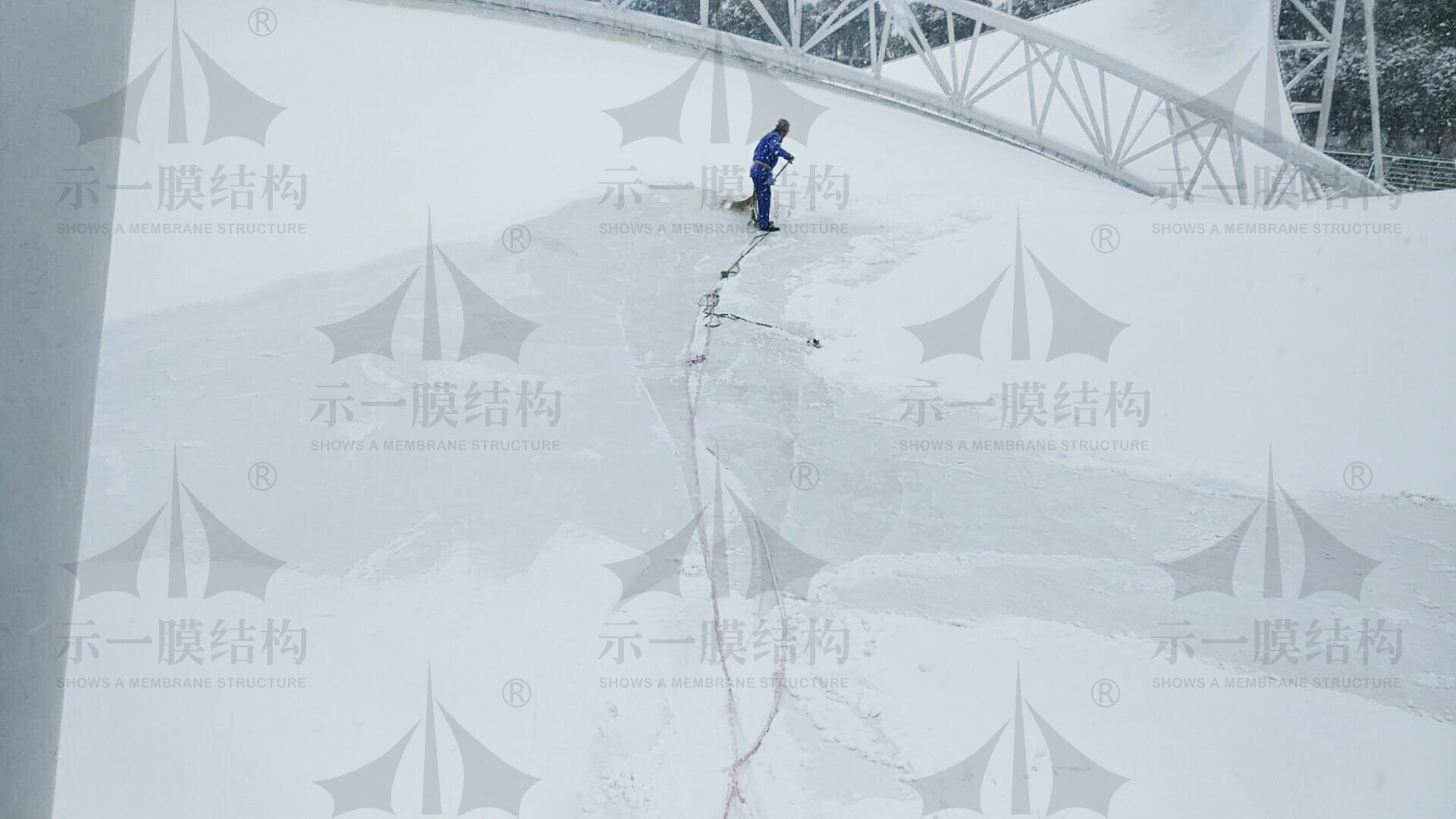 我們在實際面臨的問題需要進行分析和考量。通常建議是在下雪前恰當撒些許融雪劑在簡單積雪的膜布外表,或許看見積雪較厚還將會繼續下雪的當地撒恰當融雪劑。為了避免積雪現象引發的事故,通常會在膜結構建筑物的外周設置堆雪平臺以存放滑落的積雪,目前國內一般采用人工除雪。另外可考慮在積雪最嚴重的局部位置設置加熱裝置,膜面加熱裝置可用來加速降雪期間冰雪的融化。
