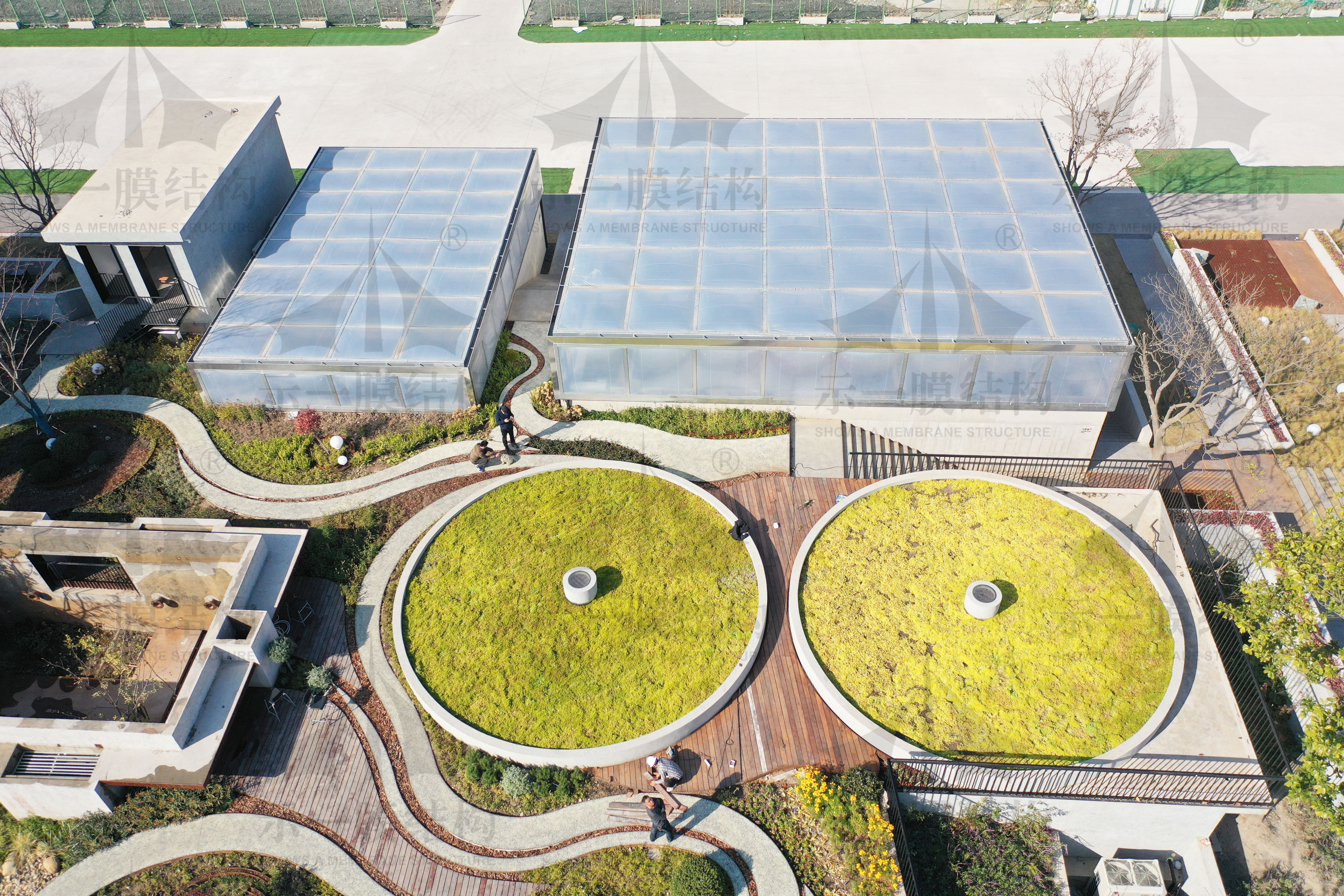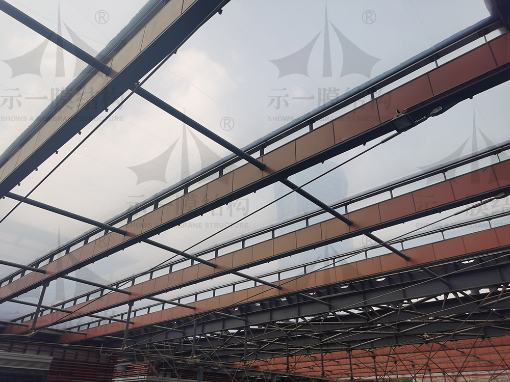 ETFE膜材是透明色,很多膜結(jié)構(gòu)工程使用ETFE膜材作為屋頂使用材料。這樣不僅在外觀上凸顯新穎,同時也給膜結(jié)構(gòu)建筑視覺增加了光亮。