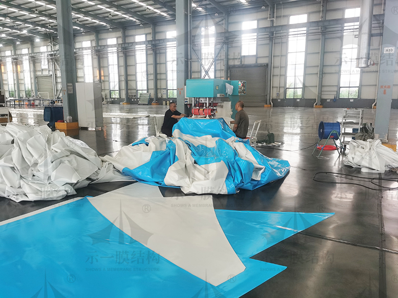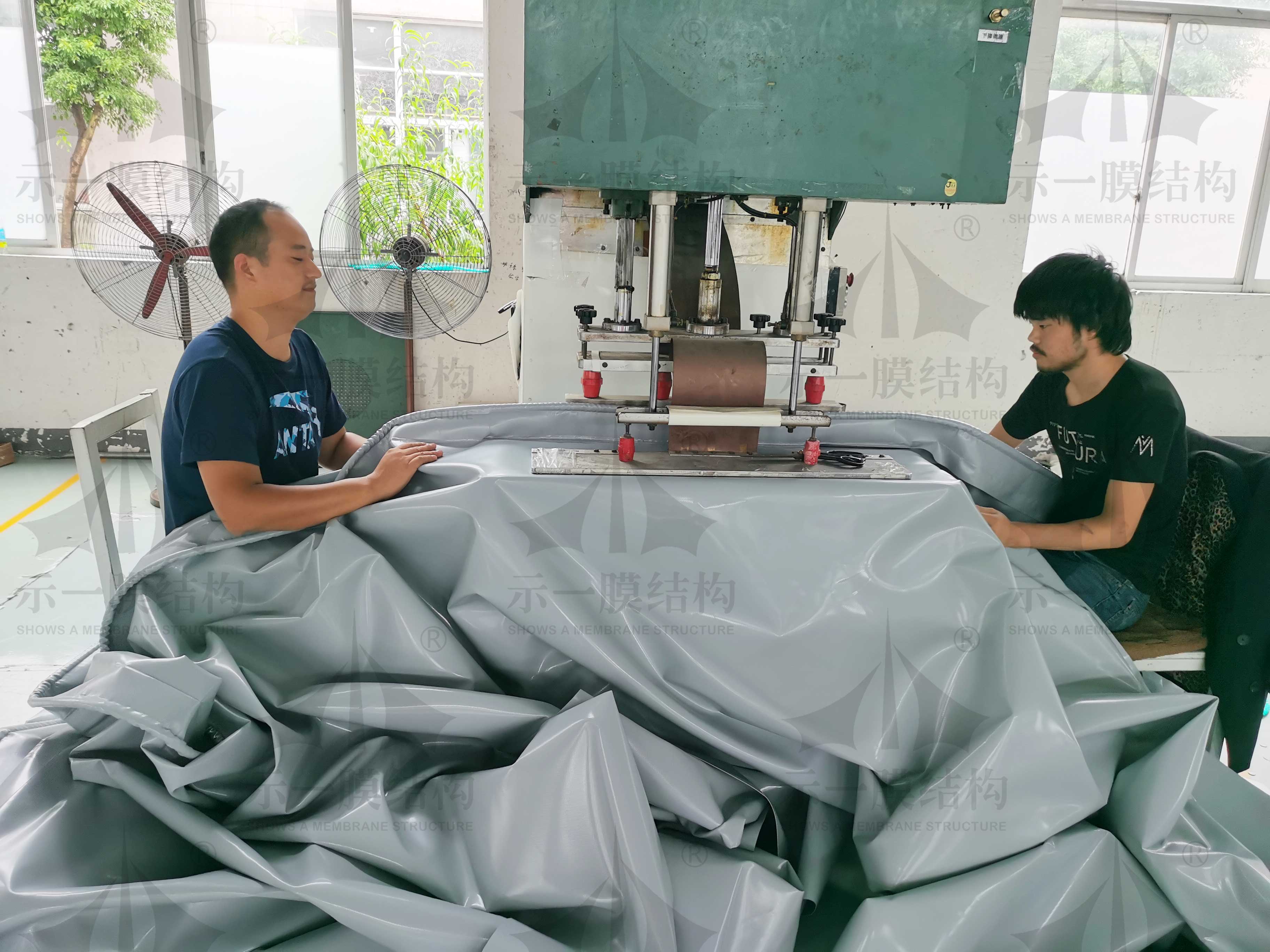 熱焊接是加熱粘合縫,并使織物上層的涂層熔融,然后施加壓力并使粘合縫冷卻。可以通過向膜材吹熱空氣,或者讓膜材接觸加熱物件,或者通過高頻電磁波,使得膜材獲得相應的熱量。 熱和粘合使用于PVC涂覆聚酯長絲織物和PTFE涂覆玻璃纖維織物。而對于PTFE涂覆玻璃纖維織物來說,由于PTFE不能自己熱熔,就需要在內層采用一種不同的材料。