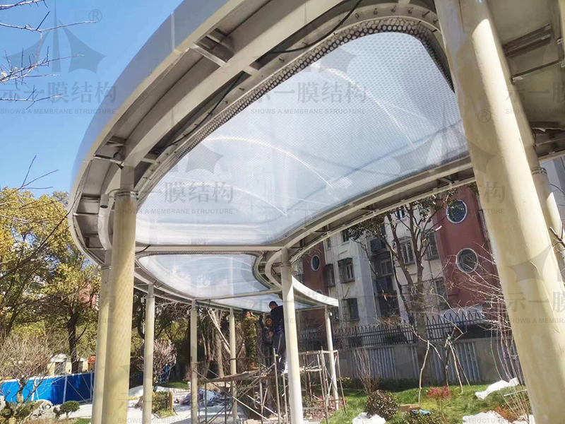 一般情況下,膜結(jié)構(gòu)子分部工程可按制作分項(xiàng)工程與安裝分項(xiàng)工程進(jìn)行驗(yàn)收,但在實(shí)際工程中也可僅劃分為膜結(jié)構(gòu)安裝分項(xiàng)工程,膜單元成品可按材料/構(gòu)配件進(jìn)場報(bào)驗(yàn)的方式直接報(bào)驗(yàn),需提供數(shù)量清單、質(zhì)量證明、過程控制、自檢結(jié)果等文件。膜結(jié)構(gòu)工程中施加預(yù)張力是一關(guān)鍵環(huán)節(jié),其施加過程和數(shù)值記錄應(yīng)該包含在施工現(xiàn)場質(zhì)量管理檢查記錄中。膜結(jié)構(gòu)、鋼構(gòu)件、索等在制作、安裝過程中均可能出現(xiàn)尺寸誤差,膜面還可能局部出現(xiàn)褶皺,如經(jīng)設(shè)計(jì)、制作、安裝方協(xié)商,認(rèn)為不影響安全使用,即可不做處理。對于膜面張力值的檢查,目前國內(nèi)外尚無能夠準(zhǔn)確測量膜面張力的儀器,此項(xiàng)規(guī)定不要求強(qiáng)制執(zhí)行,但要求進(jìn)行過程控制,并做經(jīng)驗(yàn)判斷。