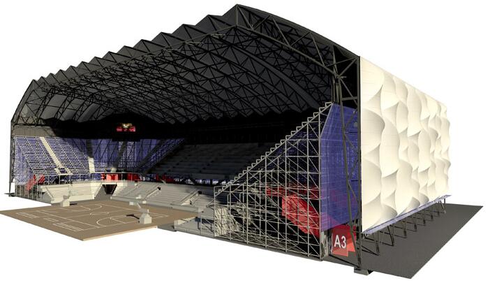 倫敦奧運會籃球館是奧運會歷史上最大的膜結構臨時場館。其位于北端的高地,非常醒目。這里有12000個座位,舉行過籃球,手球,輪椅籃球和輪椅手球比賽。雖然當時預算緊張,但并不妨礙該籃球館成為2012倫敦奧運會最具視覺沖擊力的建筑。
