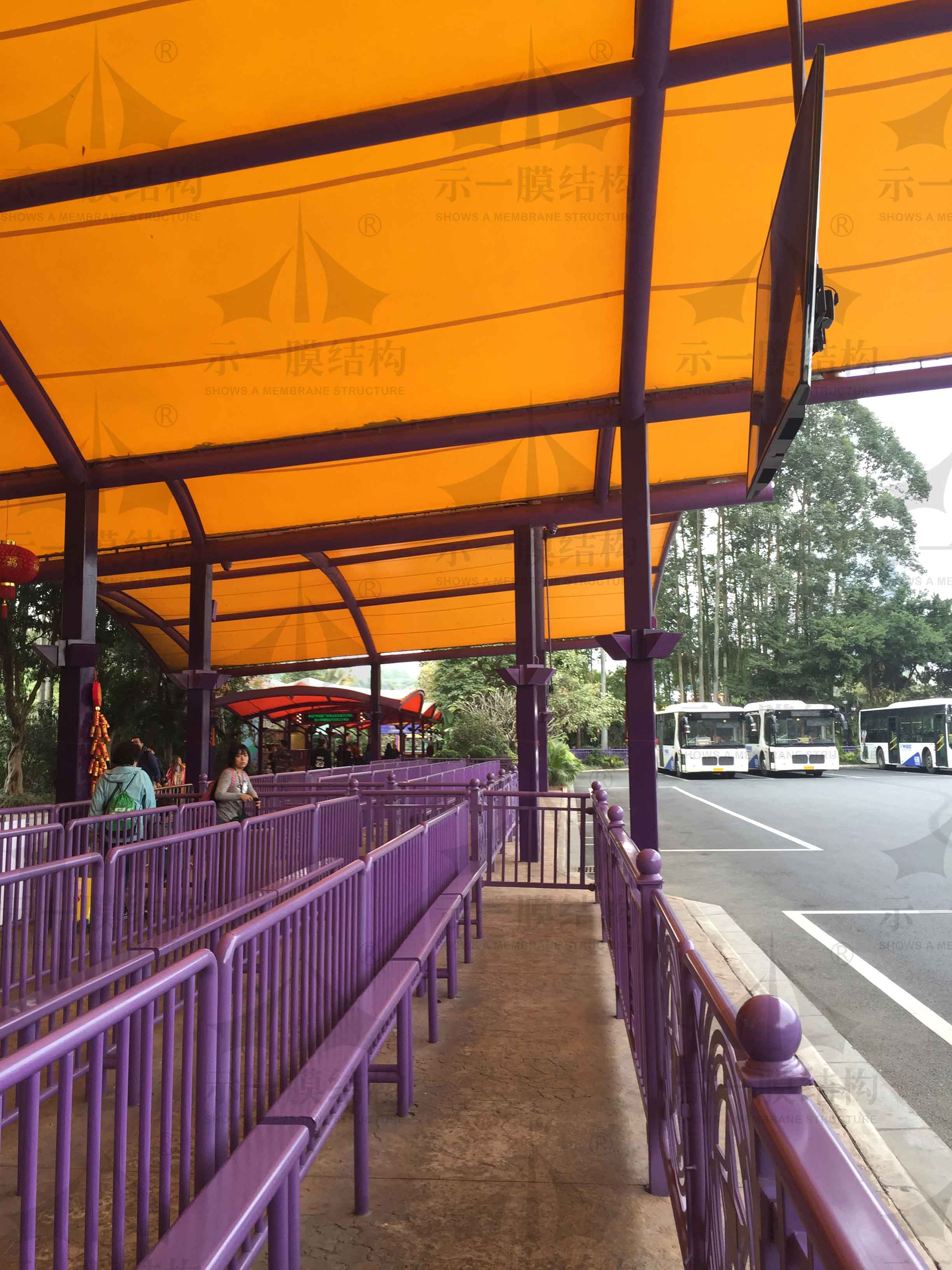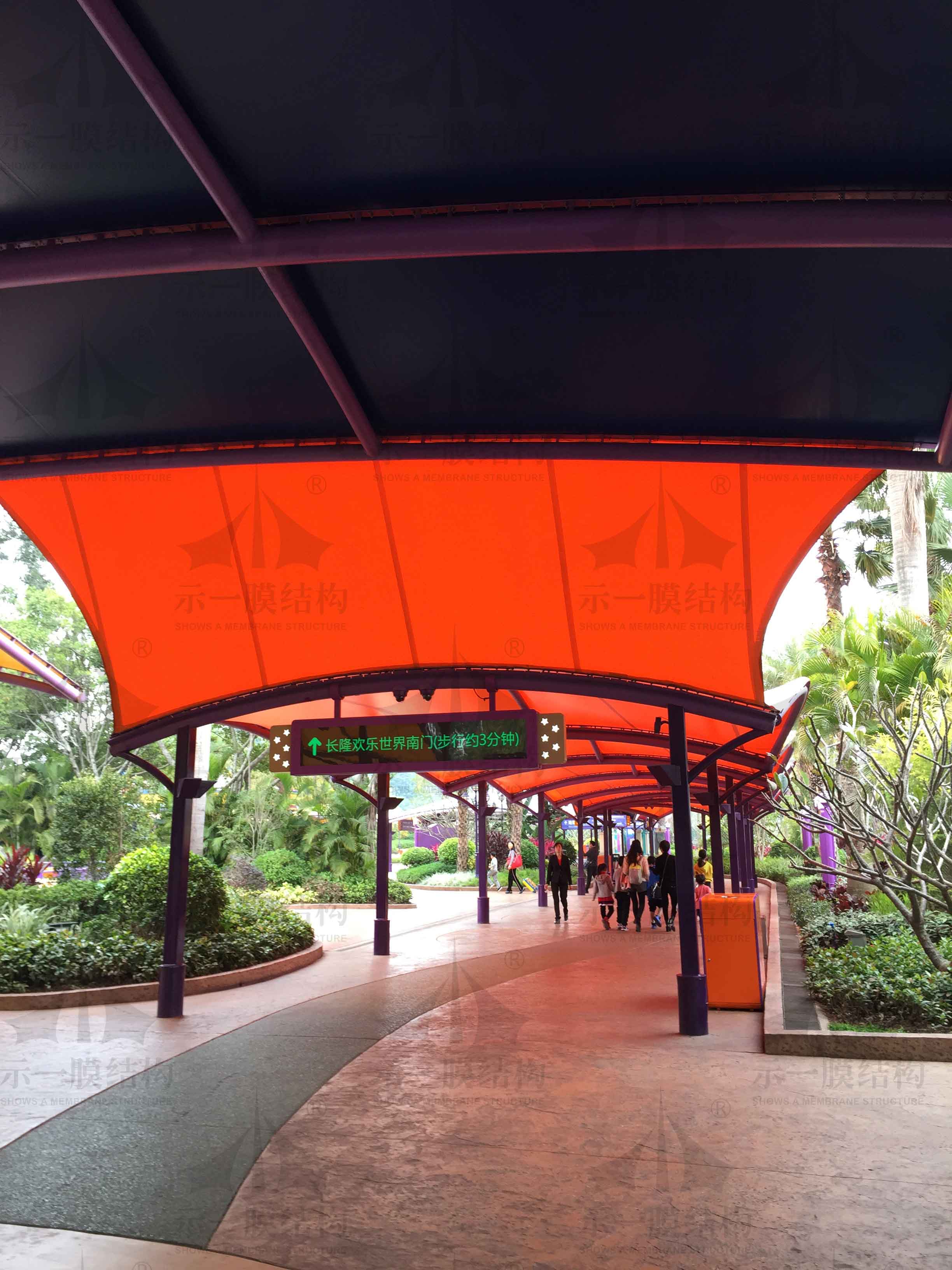 廣州長隆歡樂世界,從地鐵口走出來就是一個個膜結構遮陽棚,就算是下雨了,也沒有關系,真是太暖心了!在膜結構遮陽棚下面等著景區的穿梭巴士,也不會擔心皮膚會曬黑了。抬頭那一片橘色的膜布在視覺上很有震感,堪稱完美搭配。