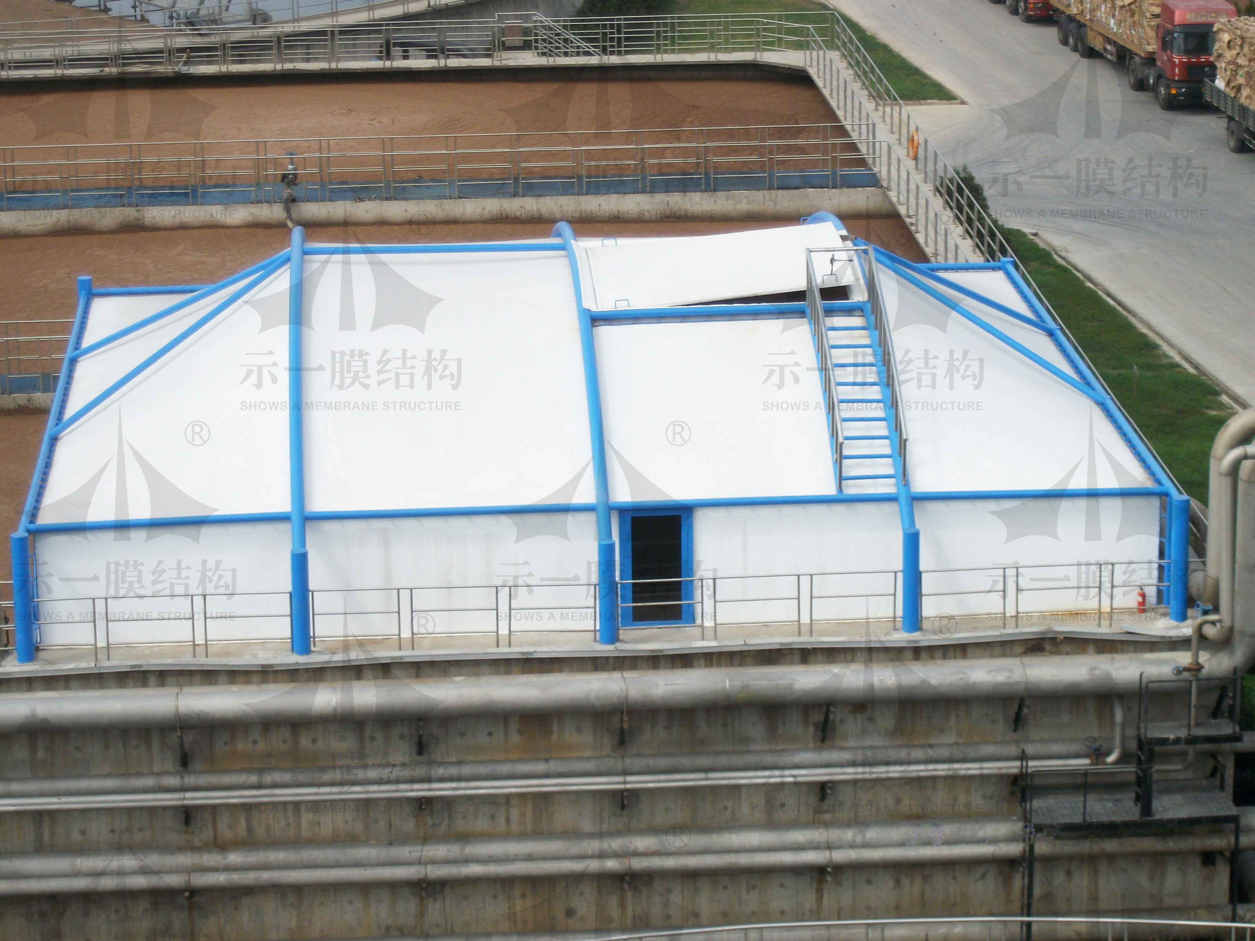 示一膜結(jié)構(gòu)小編一說到夏季想到了污水池,污水池散發(fā)的臭味不僅給環(huán)境造成了破壞,對人們的身體健康也是一大危害。膜結(jié)構(gòu)加蓋的處理方式是目前運用比較多一種處理方式。今天小編想介紹關(guān)于污水池反吊膜膜面破損的修復(fù)方式,大致可以分成兩部分來分析。