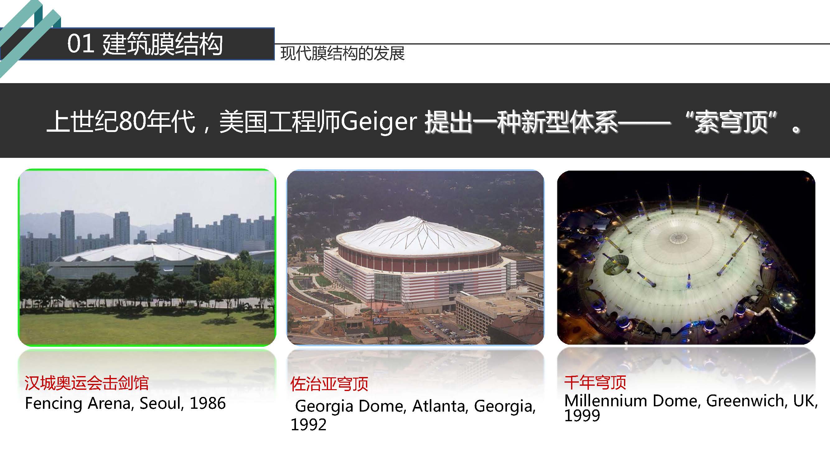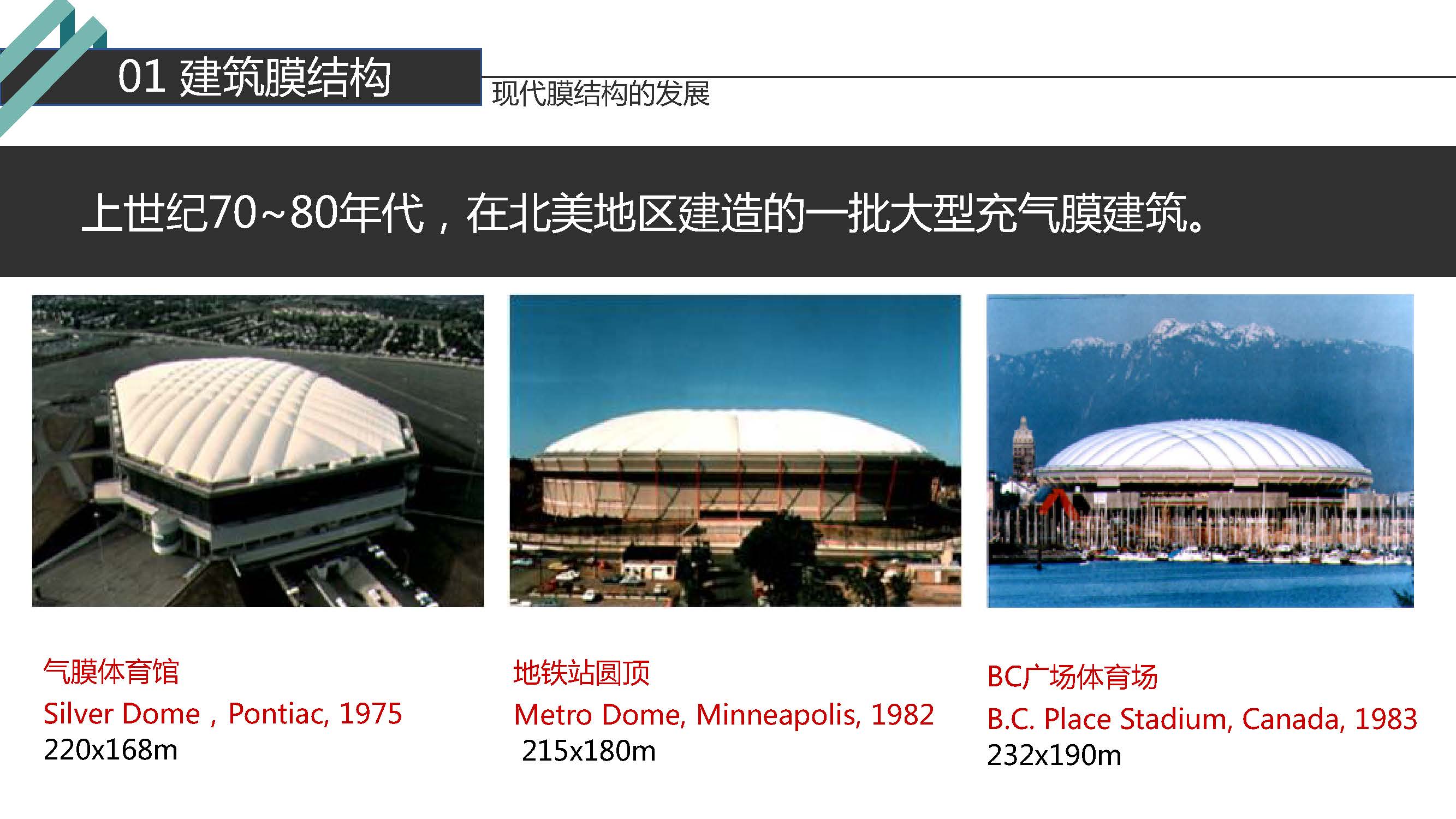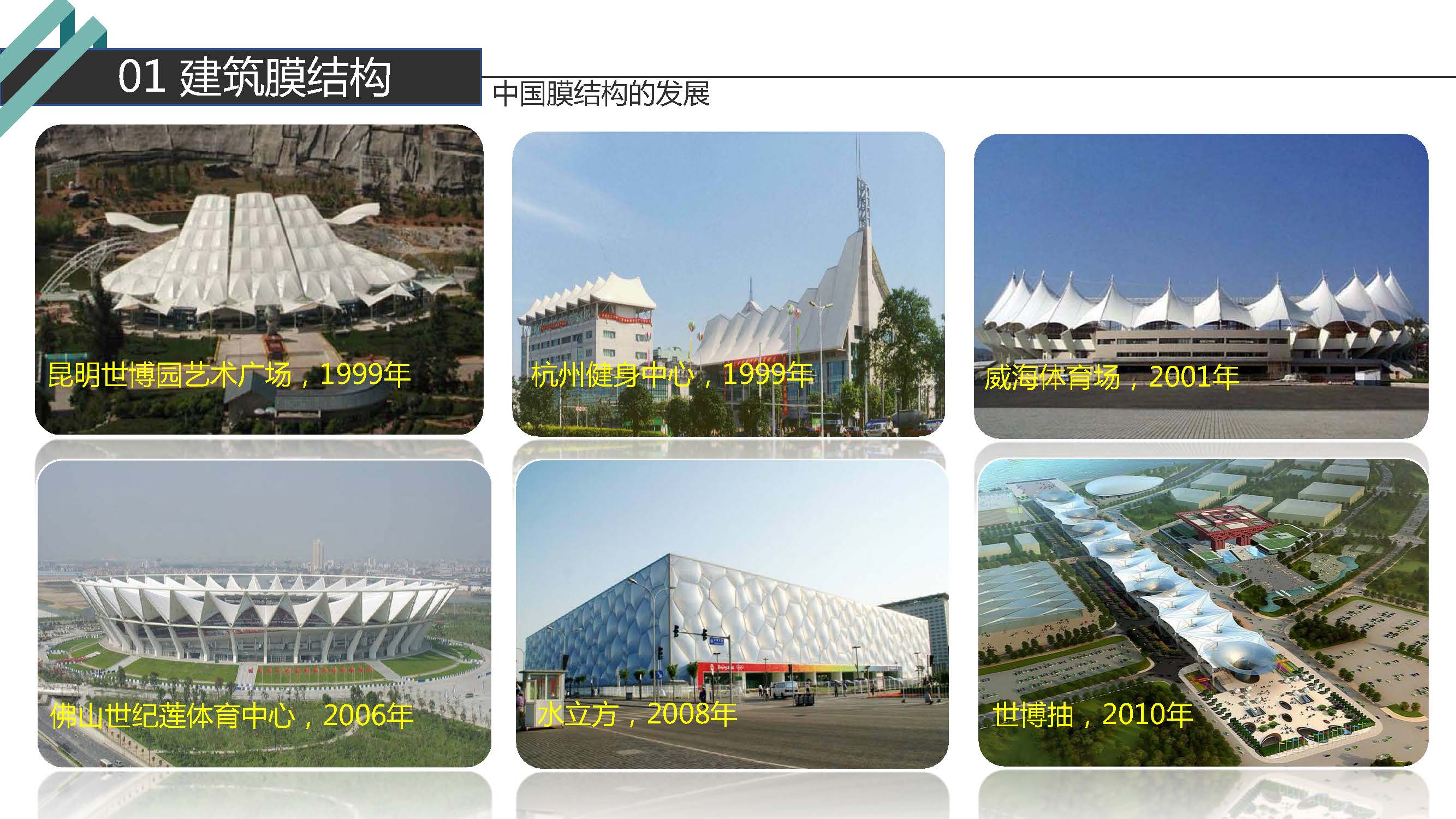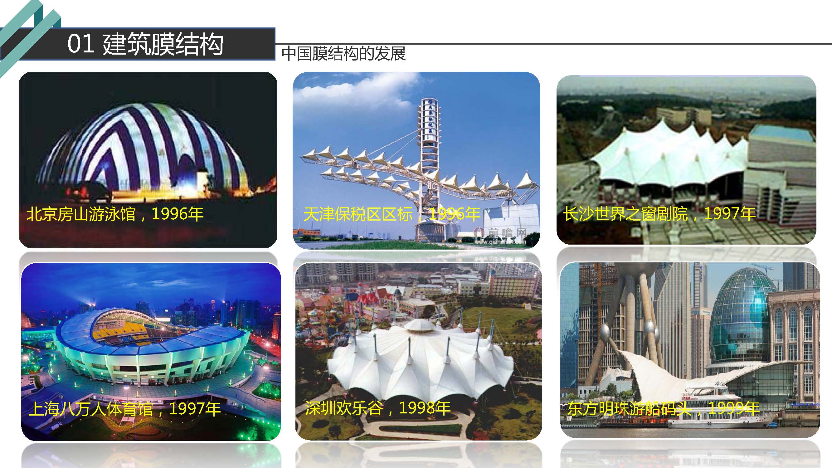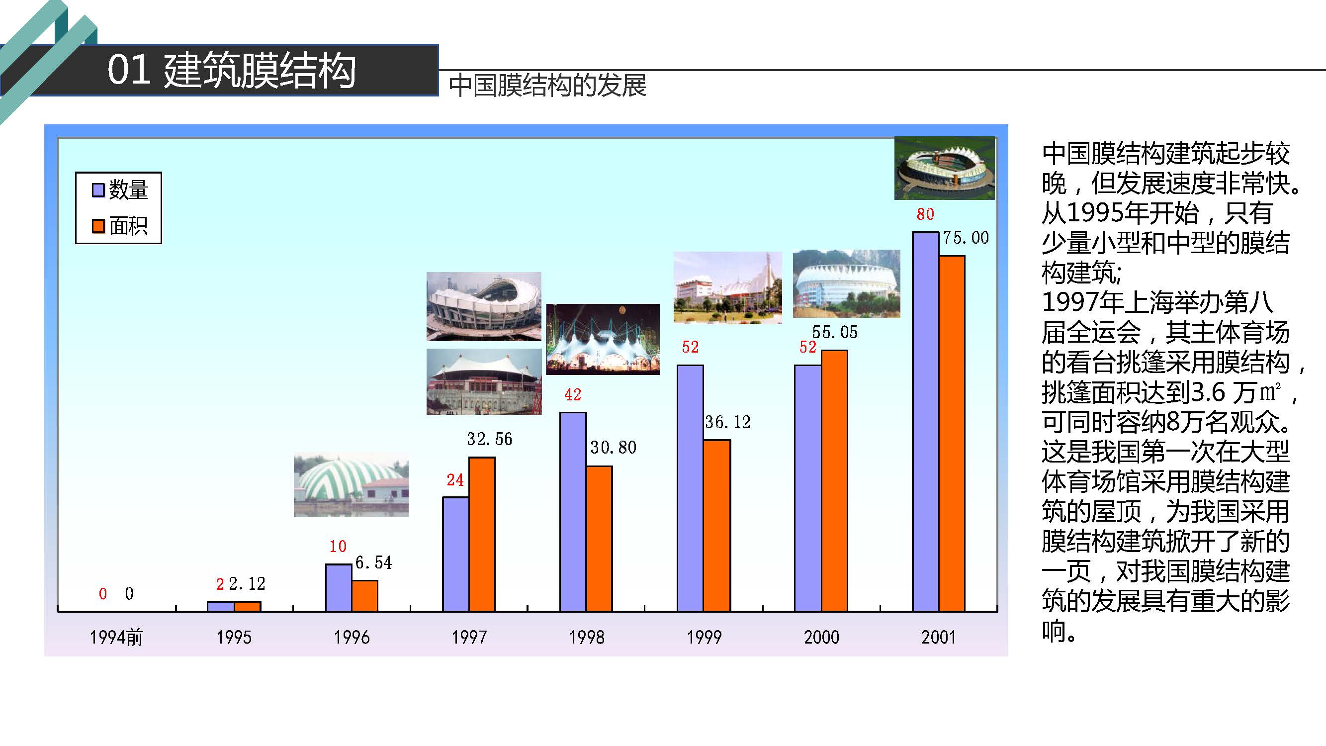 中國膜結構建筑雖然起步較晚,但是發(fā)展速度非常快。從1995年開始,只建造了一個面積為3300㎡的膜結構,1997年前國內只有少量小型和中型的膜結構建筑;1997年上海舉辦第八屆全運會,其主體育場的看臺挑篷采用膜結構,挑篷面積達到3.6 萬㎡,可同時容納8萬名觀眾。這是我國第一次在大型體育場館采用膜結構建筑的屋頂,為我國采用膜結構建筑掀開了新的一頁,對我國膜結構建筑的發(fā)展具有重大的影響。