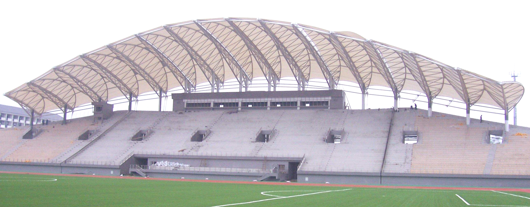 PTFE膜材是在超細玻璃纖維織物上涂以聚四氟乙烯樹脂而成的材料。PTFE膜材料的織物基材為玻璃纖維,纖維的直徑范圍應在3.30~4.05μm 范圍內,重量應大于150g/m。PTFE膜材料的厚度宜大于0.5mm。廣泛應用在大型公共設施:體育場館的屋頂系統、機場大廳、展覽中心、站臺等。
